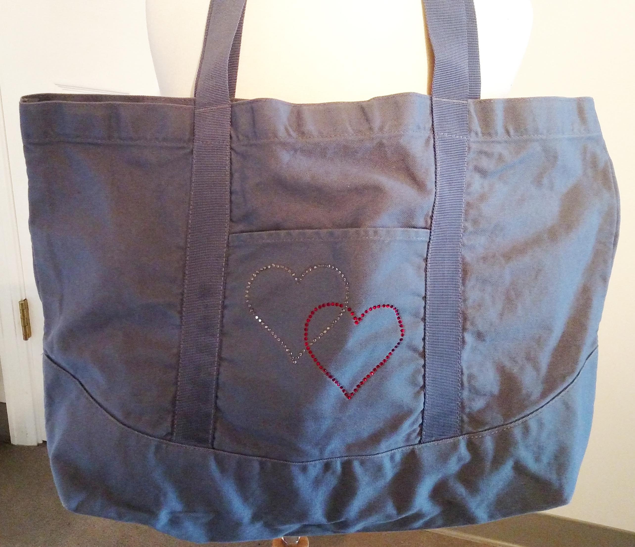 This is a blue denim-colored 100% cotton canvas tote bag with a pair of entwined hearts made from red and white rhinestones. The bag is 15" high X 18" wide X 10" deep with nylon webbing straps. The rhinestones are on the front pocket. There is a large, open main compartment with snap closure and an inside hanging zippered pocket.